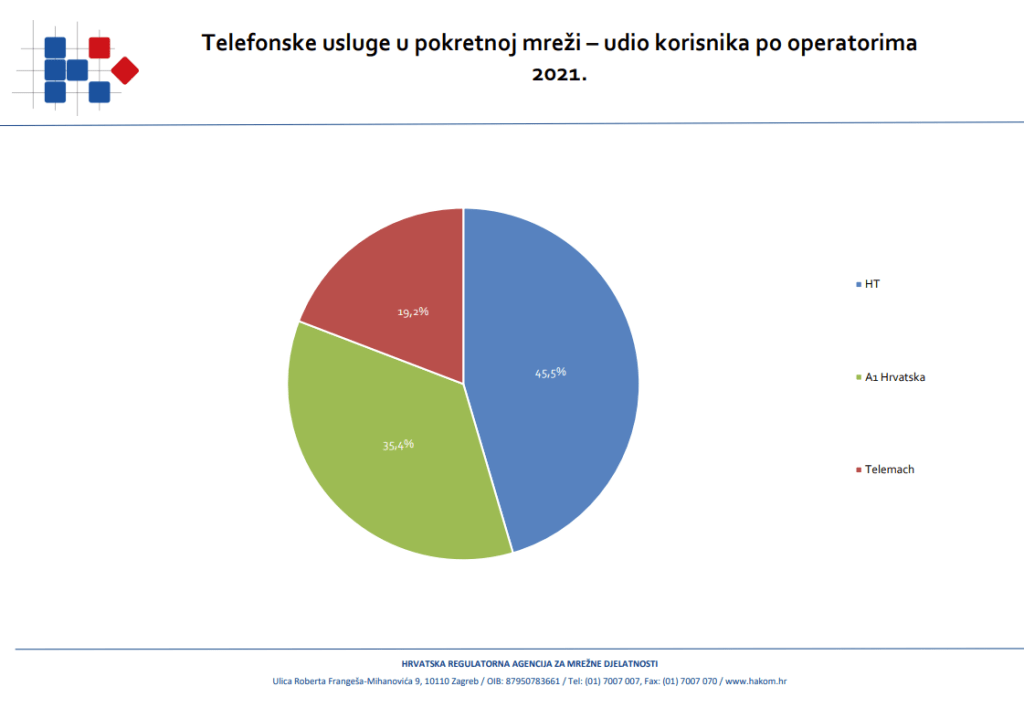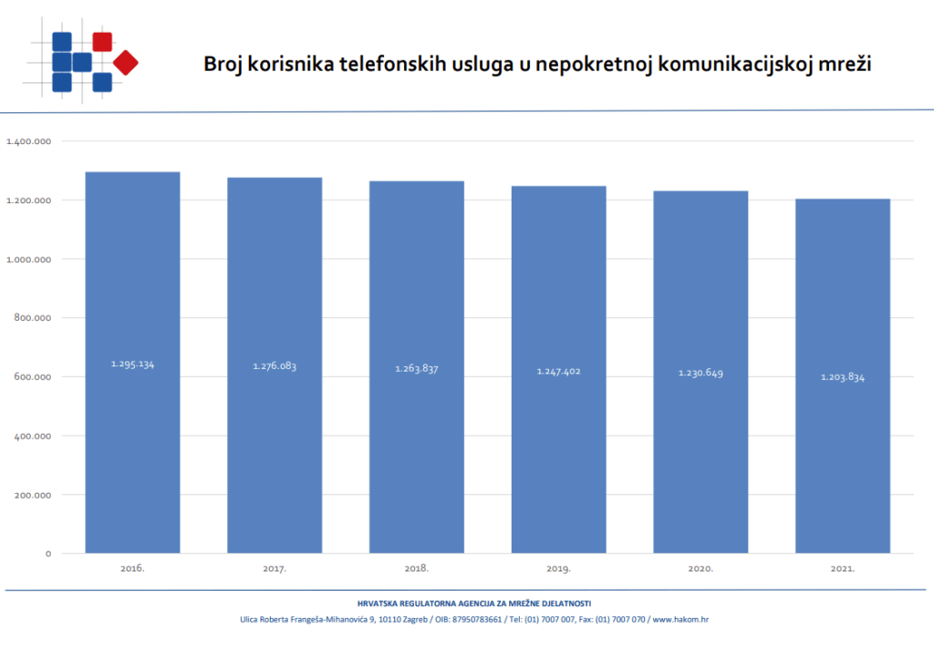 Tržište telefonskih usluga u nepokretnoj mreži kontinuirano bilježi pad, a iznimka nije ni drugo tromjesečje. U odnosu na isto razdoblje 2021. ukupni prihodi od korištenja fiksnim telefonima 5,7 posto su niži, broj korisnika niži je za 1,4 posto, dok se ukupni odlazni promet smanjio za 19,3 posto.