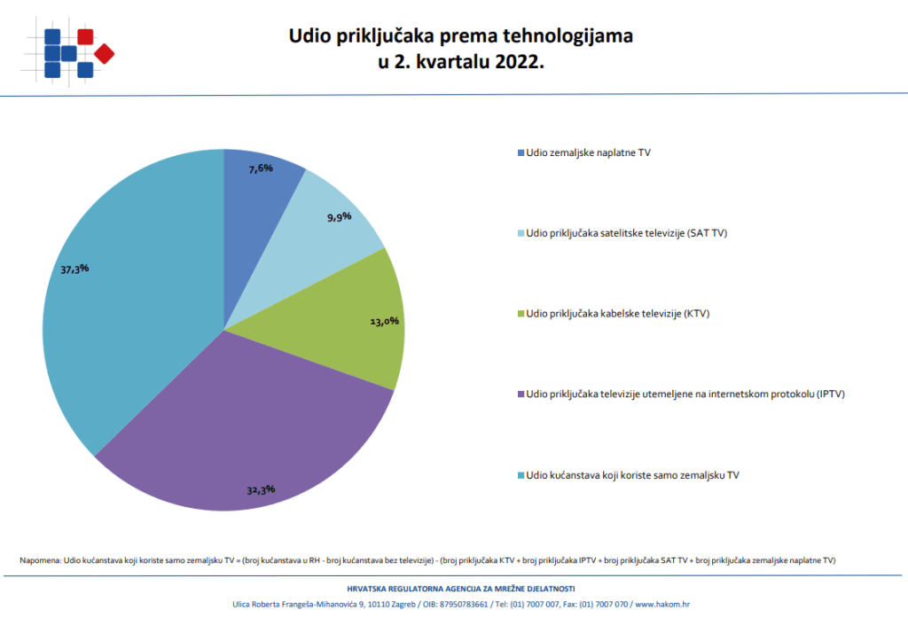 Ukupan broj priključaka naplatne televizije iznosio je preko 932 tisuće i viši je za gotovo 60.000 novih priključaka u odnosu na drugo tromjesečje prošle godine. Trend rasta vidljiv je i na ukupnim prihodima te na porastu broja kućanstava koja gledaju neki oblik naplatne televizije. Tako su ukupni prihodi veći za 4,5 posto, a dva od tri kućanstava televiziju prati putem nekog od oblika naplatne televizije (66,5 posto). Za usporedbu, u drugom tromjesečju 2021. naplatnu televiziju pratilo je 59 posto kućanstava.