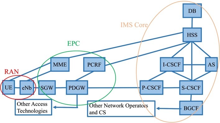 Na slici 2 predočeni su glavni čvorovi u IMS jezgri. Kao što je i vidljivo sa slike, dva temeljna stupa IMS-a su funkcija za nadzor sjednice (skr. CSCF od engl. Call Session Control Function) i poslužitelj pretplatnika (skr. HSS od eng. Home Subscriber Server) pružatelja usluge IMS. CSCF se sastoji od 4 glavne uloge: P-CSCF (engl. Proxy-CSCF), I-CSCF (engl. Interrogating-CSCF), S-CSCF (engl. Serving-CSCF) i E-CSCF (engl. Emergency-CSCF), koji nije prikazan na slici 2. P-CSCF je često objedinjen s A-SBC-om (engl. Access-Session Border Controller) koji služi za kontrolu pristupa IMS-u i obično je prvi kontakt između korisnika i mreže IMS. P-CSCF je također zaslužan za kompresiju SIP poruka, sigurnost i autentifikaciju korisnika te kontaktira mrežne elemente PDGW/PCEF (engl. Packet Data Gateway/Policy and Charging Enforcement Function) i PCRF (engl. Policy and Charging Rules Function) koji služe za implementaciju pravila za ispravno korištenje medijskih resursa i usluga. P-CSCF nalazi odgovarajući I-CSCF kontaktirajući poslužitelj DNS (engl. Domain Name Server). Nakon toga, I-CSCF mora biti u stanju kontaktirati poslužitelj HSS preko protokola Diameter i iz dohvaćenih podataka dodijeliti korisniku S-CSCF koji će ga opsluživati. S-CSCF ima ulogu „mozga“ u cijeloj mreži IMS i služi kao „pametni“ čvor koji će nadzirati multimedijsku sjednicu, preuzeti korisničke profile s poslužitelja HSS tijekom registracije, rukovoditi deregistracijom te će omogućiti ispravno usmjeravanje poruka/paketa.