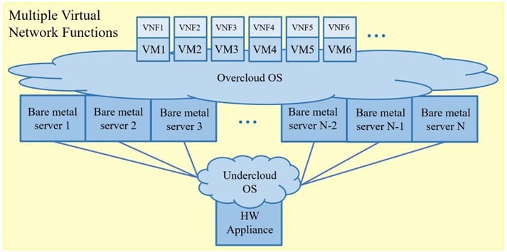 Mreža 5G IMS implementira virtualizaciju mrežnih funkcija (skr. NFV od engl. Network Function Virtualization), što znači da će fizički strojevi za svaki čvor biti zamijenjeni virtualnim (skr. VM od engl. Virtual Machines). Zahtjev koji se postavlja za takvu mrežu je dovoljna procesorska moć, memorija i pohrana podataka. Zato se obično prije instalacije virtualnih strojeva i mrežnih funkcija instalira usluga oblaka u načinu rada visoke dostupnosti (npr. TripleO distribucija Openstacka). Takav oblak izgrađen je od podoblaka (engl. undercloud) i nadoblaka (eng. overcloud). Podoblak je instaliran na jedan fizički stroj i ima funkciju nadgledatelja fizičkih poslužitelja od kojih se sastoji nadoblak. Nadoblak, pak, ima funkciju nadgledatelja virtualnih strojeva na kojima su instalirane aplikacije mrežnih funkcija. Slika 4 prikazuje gradivne elemente virtualnih mrežnih funkcija u mreži 5G IMS.