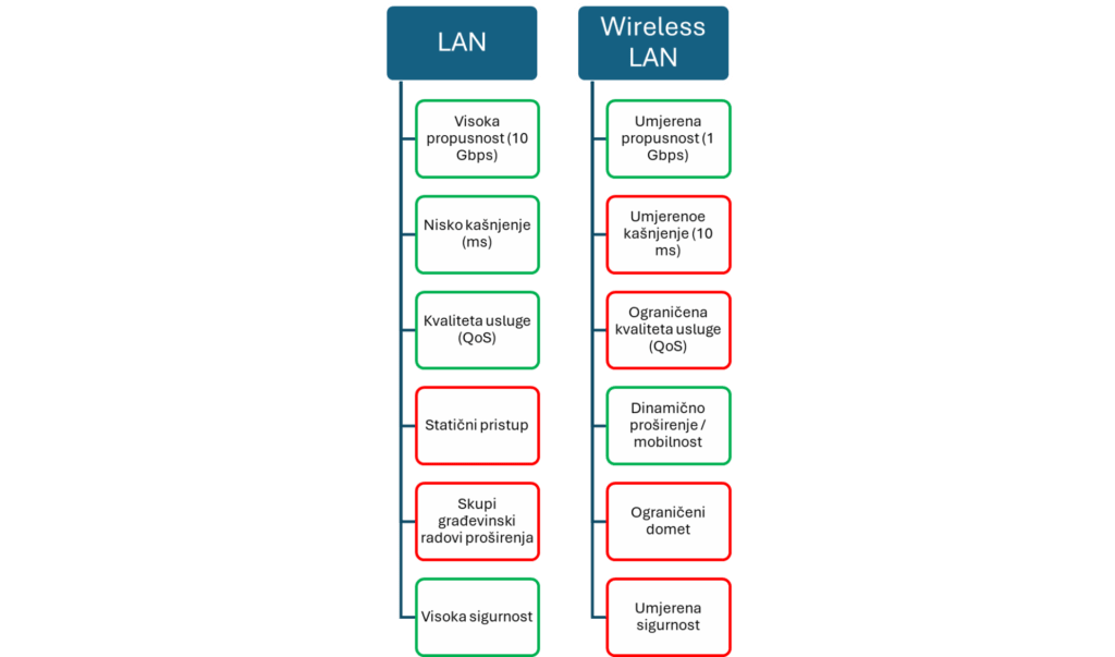 Dva najčešća komunikacijska rješenja koja se danas koriste u industrijama su fiksno/žičano LAN (Local Area Network) rješenje i naravno bežično LAN rješenje, WiFi ili Wireless LAN. Neke od prednosti i nedostataka (bolje rečeno izazova) obje tehnologije su prikazane sljedećom slikom.