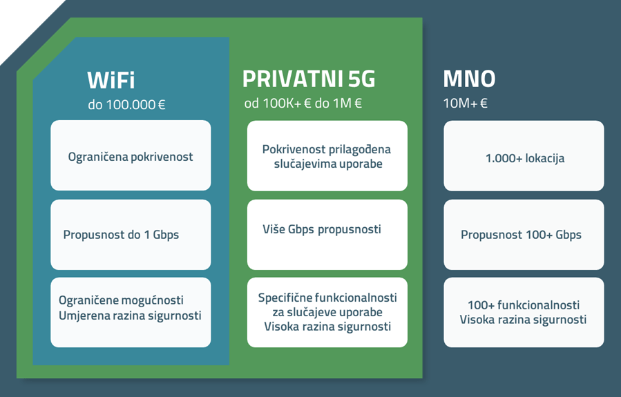 Sa druge strane 5G mreže koje rade mobilni operateri iziskuju ulaganja na razini desetke milijuna Eura jer se radi o puno lokacija, visokim propusnostima opreme, radio jedinicama velikih snaga te jako puno kompleksnih funkcionalnosti koje su potrebne da bi veliki broj mobilnih korisnika imao dobro korisničko iskustvo.