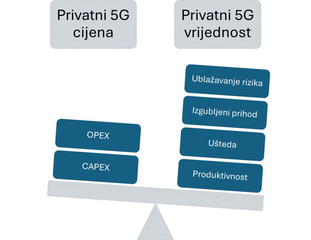Ulaganje u Privatnu 5G mrežu je skuplje od ulaganja u WiFi jer smo pokazali da Privatna 5G mreža ima prednosti nad WiFi, ali isto je puno manje nego kada gradimo 5G mrežu u stilu MNO. U Privatnim 5G mrežama se može koristiti oprema i funkcije koje su prilagođene industrijskoj potrebi te se pokrivanje radi specifično za tu namjenu. Zbog toga je očekivano ulaganje u Privatnu 5G mrežu između 100 000 € i 1 M€. Glavni pokretač troška ulaganja je veličina područja koje želimo pokriti.