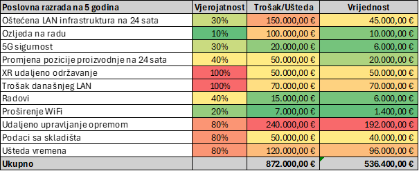 Ovakvo računanje je pojednostavljeno do krajnjih granica i treba biti jako oprezan sa računanjem ne samo za Private 5G već za bilo koje ulaganje. Naime, postoji binarni i rubni slučajevi koji mogu dovesti do katastrofalnih posljedica. Npr. vjerojatnost događaja od 5% sa procjenjenim troškom od 5 M€ povlači vrijednost 250 000€. Zaključite da je 5% premala vjerojatnost za investiciju u rješenje, ali se događaj obistini te imate trošak od 5 M€ koji može značiti kraj poslovnog subjekta.