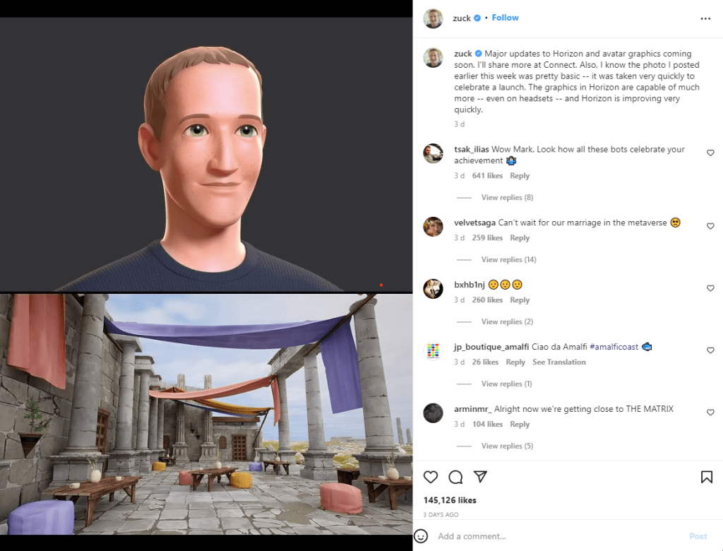 Burna reakcija nije mogla zaobići začetnika Metaverzuma te sada poručuje da kompanija intenzivno radi na grafici. Tako je u petak objavio nove slike zaslona na Instagram i Facebook, demonstrirajući znatno realističniju verziju sebe i nedefinirani trg drevnog izgleda.